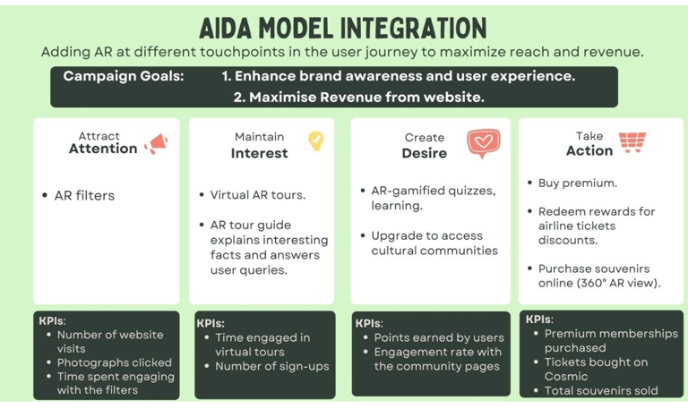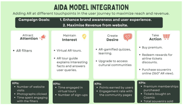 The AR tour can be created by integration with Google’s ARCore Geospatial API, for location context, and Unity for creating AR elements, along with a fine-tuned GPT model powered by the OpenAI API that can answer tourism related questions from the user (Yuen, 2023). If the primary goal of the marketing campaign is to create awareness, then prompting sign up here, will create within the user a desire for the full experience and lead them to take action at this step. However, since the focus is also on maximising revenue, the desire and action stages are further expanded.