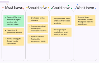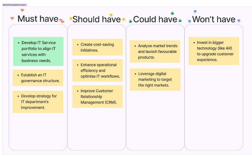 The following demonstrates how the MoSCoW prioritisation framework is applied on potential problems that can be addressed: